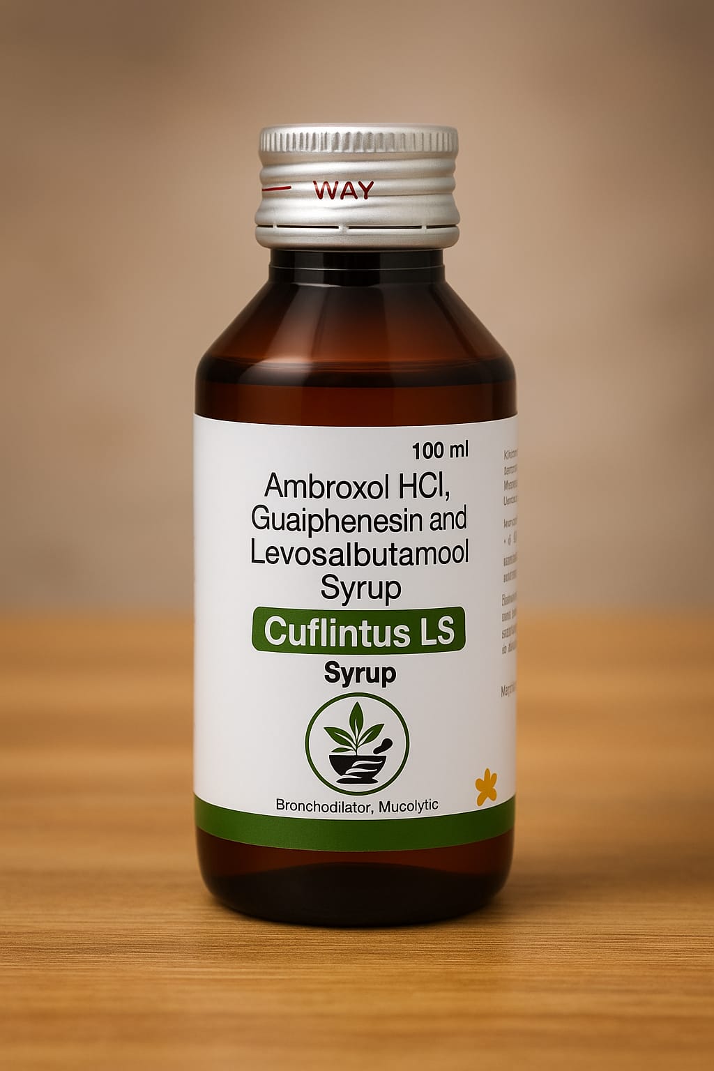 Cuflintus-LS Syrup is a combination of three medicines—Ambroxol, Levosalbutamol, and Guaifenesin. Ambroxol is a mucolytic, which thins and loosens the mucus in the airways, making it easier to cough up. Levosalbutamol is a bronchodilator that relaxes the muscles around the airways, helping to open them up and making breathing easier. Guaifenesin is an expectorant that further helps to clear mucus from the airways by making it thinner and less sticky, promoting its removal through coughing. Together, these medicines work to reduce mucus buildup, ease breathing, and relieve cough associated with mucus.